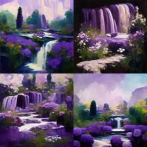 Il secondo comando è stato “peaceful garden with violet flowers and a waterfall” (un tranquillo giardino con fiori viola ed una cascata).